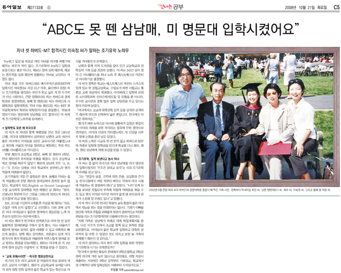 <동아일보> ABC도 못 뗀 삼남매, 미 명문대 입학시켰어요
