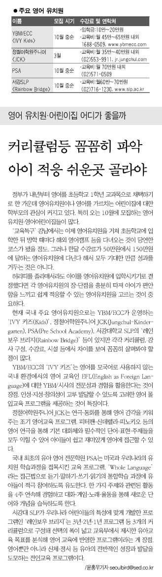 8월 9일자 서울신문 교육면에 소개된 영어 유치부 선택 요령에 관련된 기사로, SLP가 소개되었습니다.
