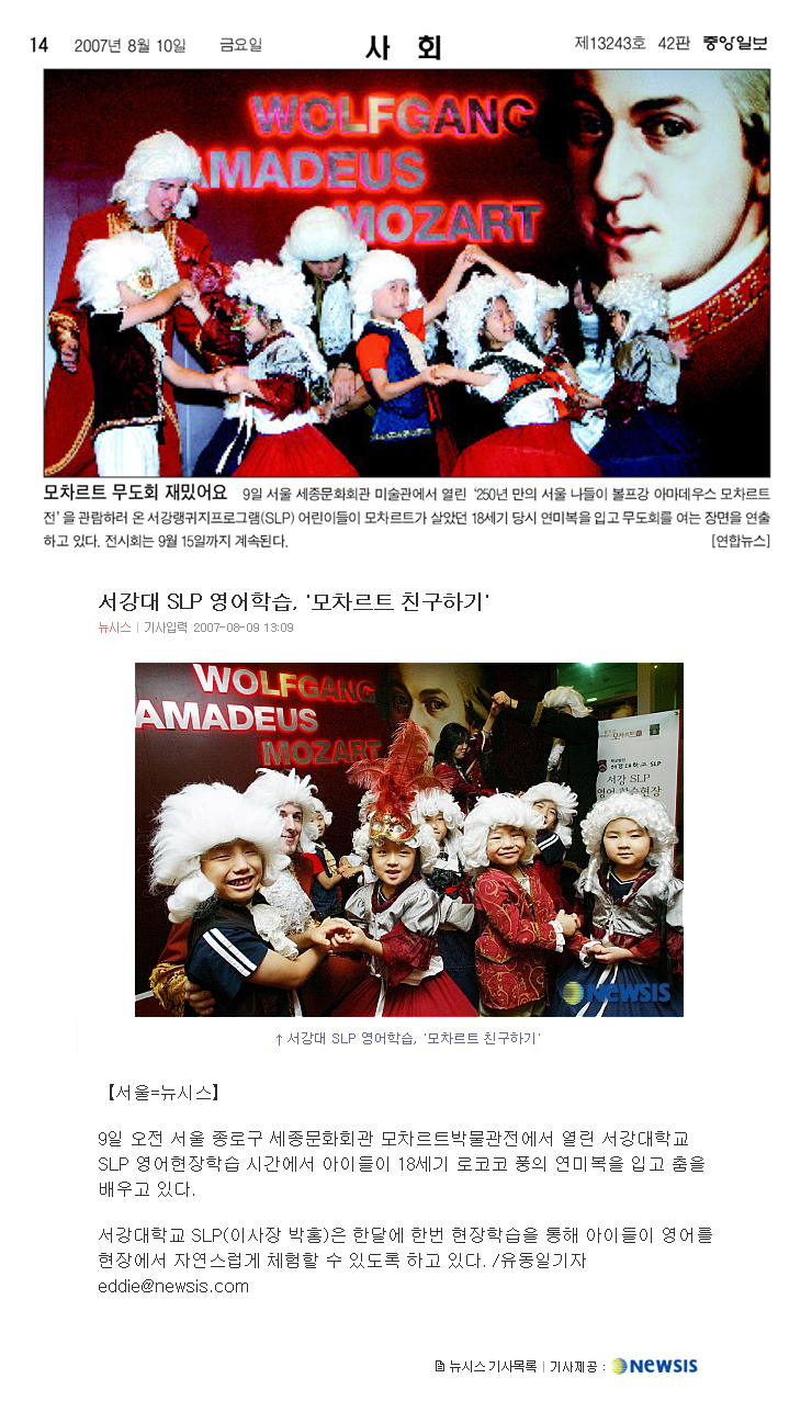 8월 9일과 10일, 중앙일보와 뉴시스에 SLP 유치부의 모차르트전 Field Trip 현장이 사진 기사로 게재 되었습니다. 한달에 한번, Field Trip을 통해 현장에서 영어를 자연스럽게 체험할 수 있는 기회를 만들어 주고 있는 유치부 교육 과정의 일부가 간접적으로 소개 되었습니다.