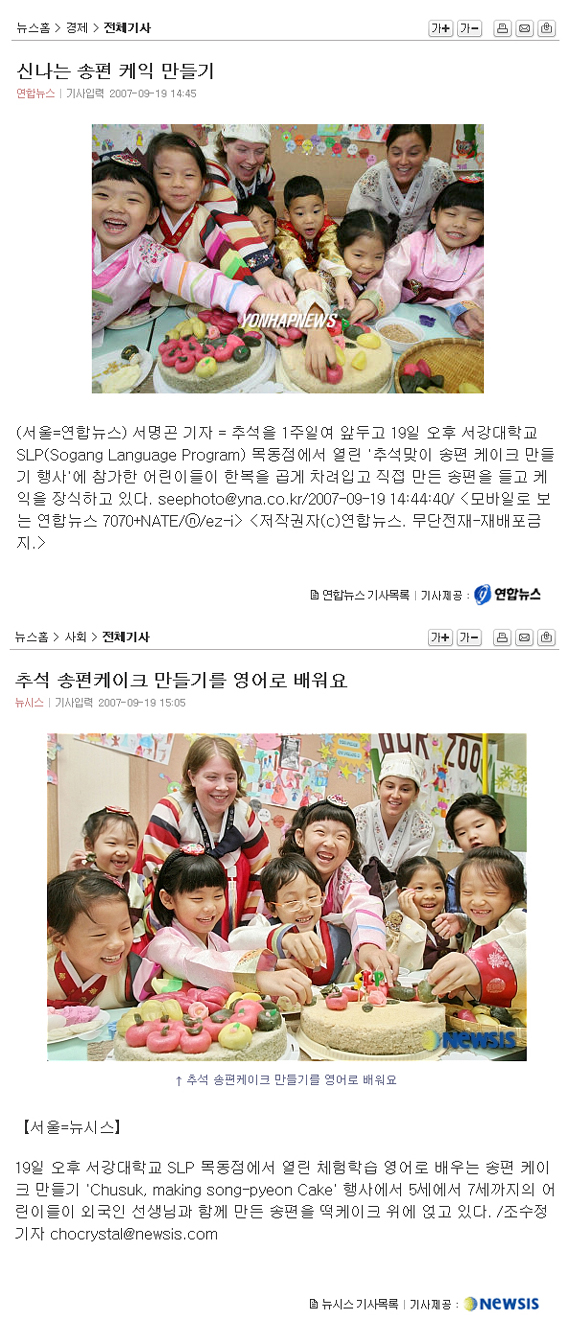 9월 19일과 20일 아시아경제신문, 연합뉴스, 뉴시스에 SLP 유치부의 추석 송편 만들기 행사가 사진 기사로 게재되었습니다.