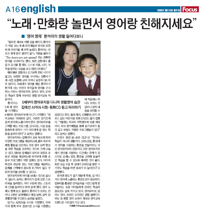 <포커스> 3월 24일자에 SLP 학생의 기사가 게재되었습니다. 영어 학원, 학부모의 조력, 온라인 학습으로 해외 체류나 유학의 경험 없이도 유창하게 영어를 구사하는 장환석(유치부 7세) 학생의 사례가 소개 되었습니다.