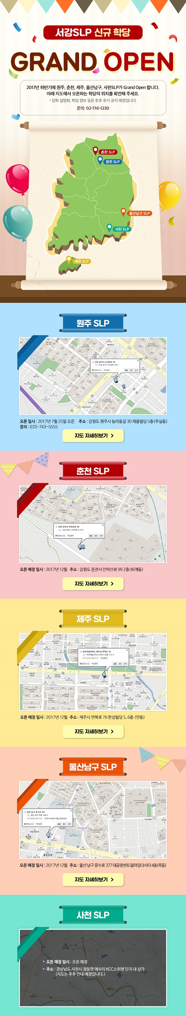 2017년 하반기에 원주, 춘천, 제주, 울산남구, 사천SLP가 Grand Open합니다. 오픈하는 학당의 위치를 확인해 주세요.